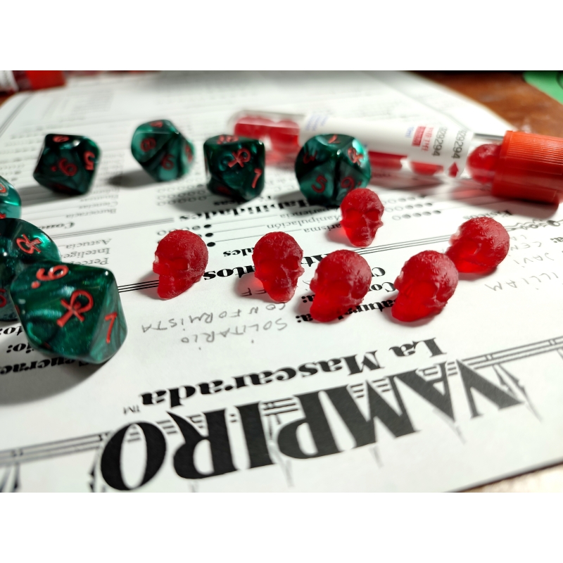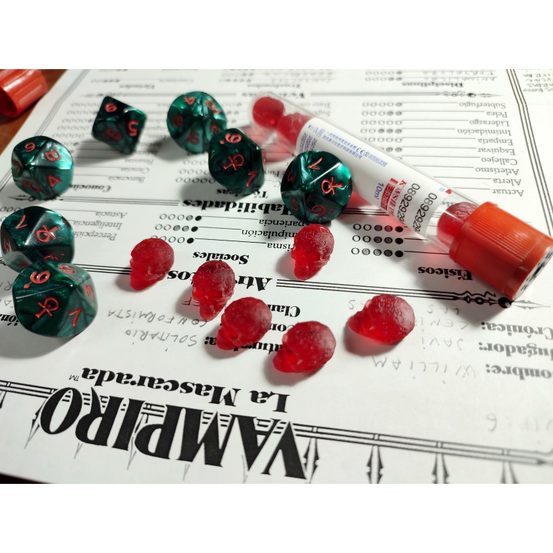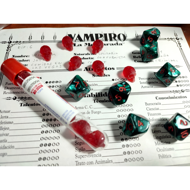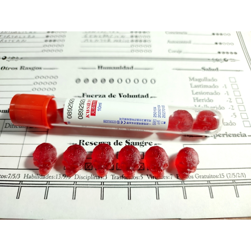 Inicia tu partida de rol de "Vampiro la mascara" con tus amigos y saca estos viales de sangre, saca tus tokens de "Puntos de sangre" y ponlos en tu ficha.