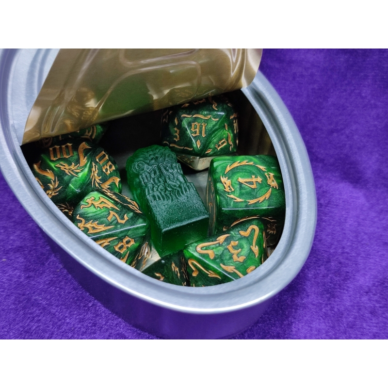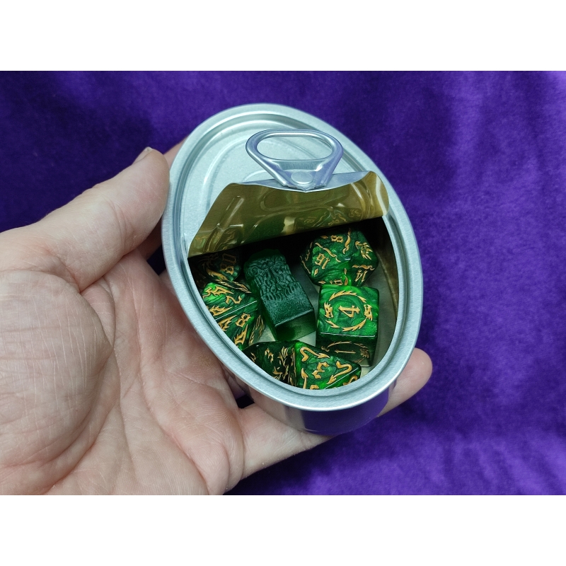 En cada lata se encuentran un juego de dados exclusivos y una miniatura, ídolo de Cthulhu.