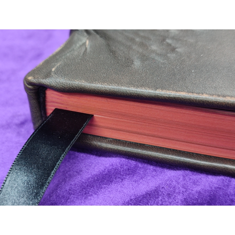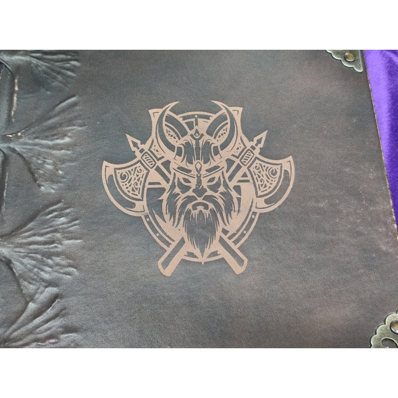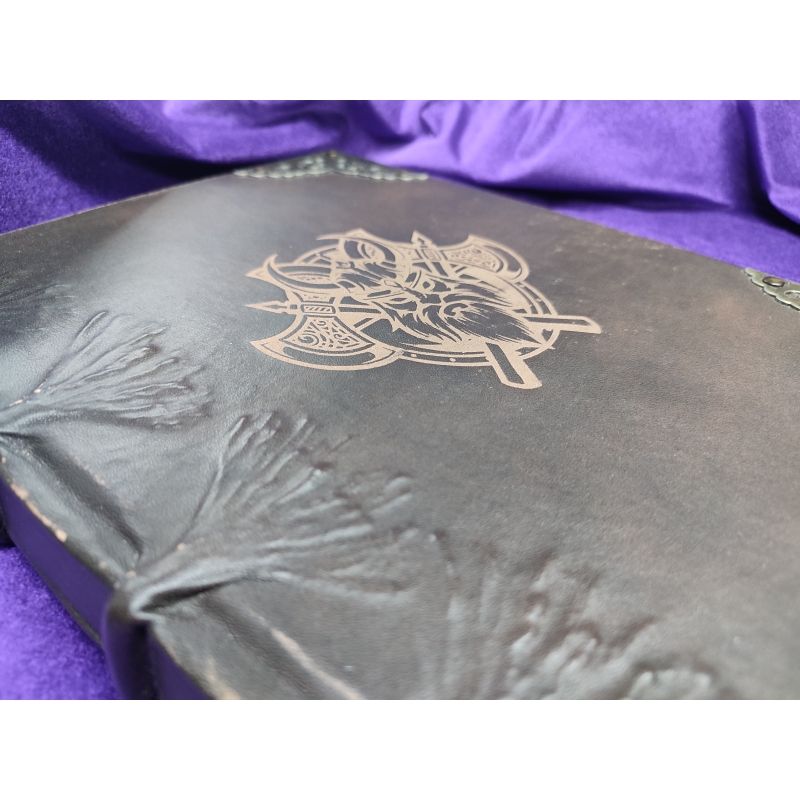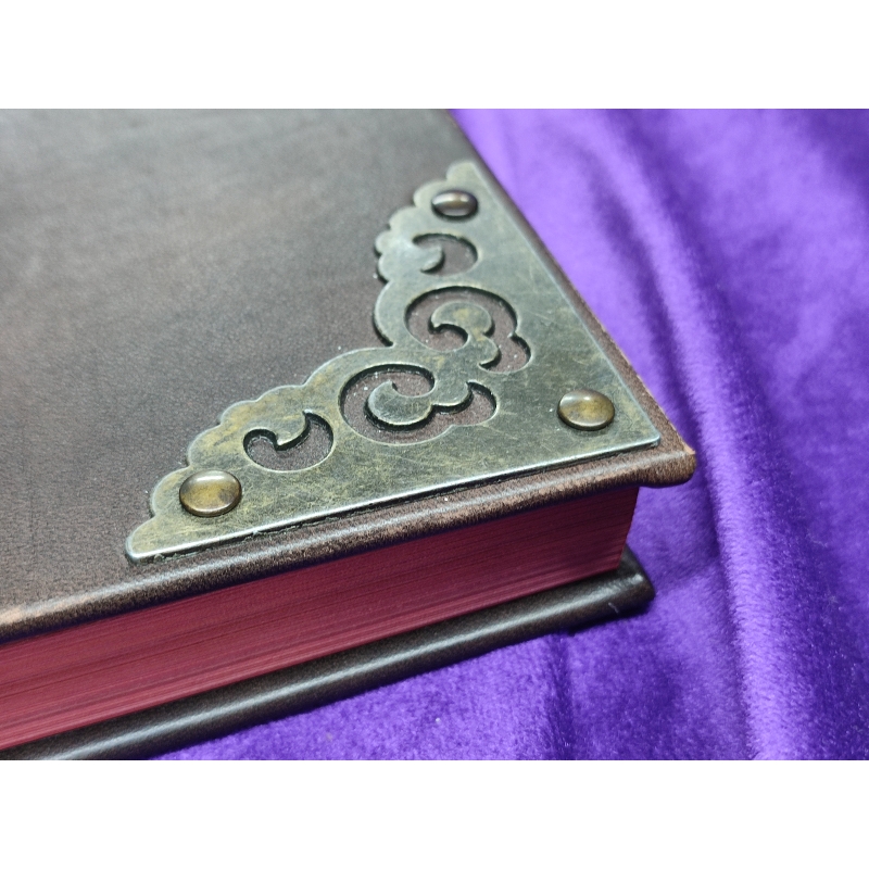 Forrado en cuero oscuro, protegido con esquinas metálicas.